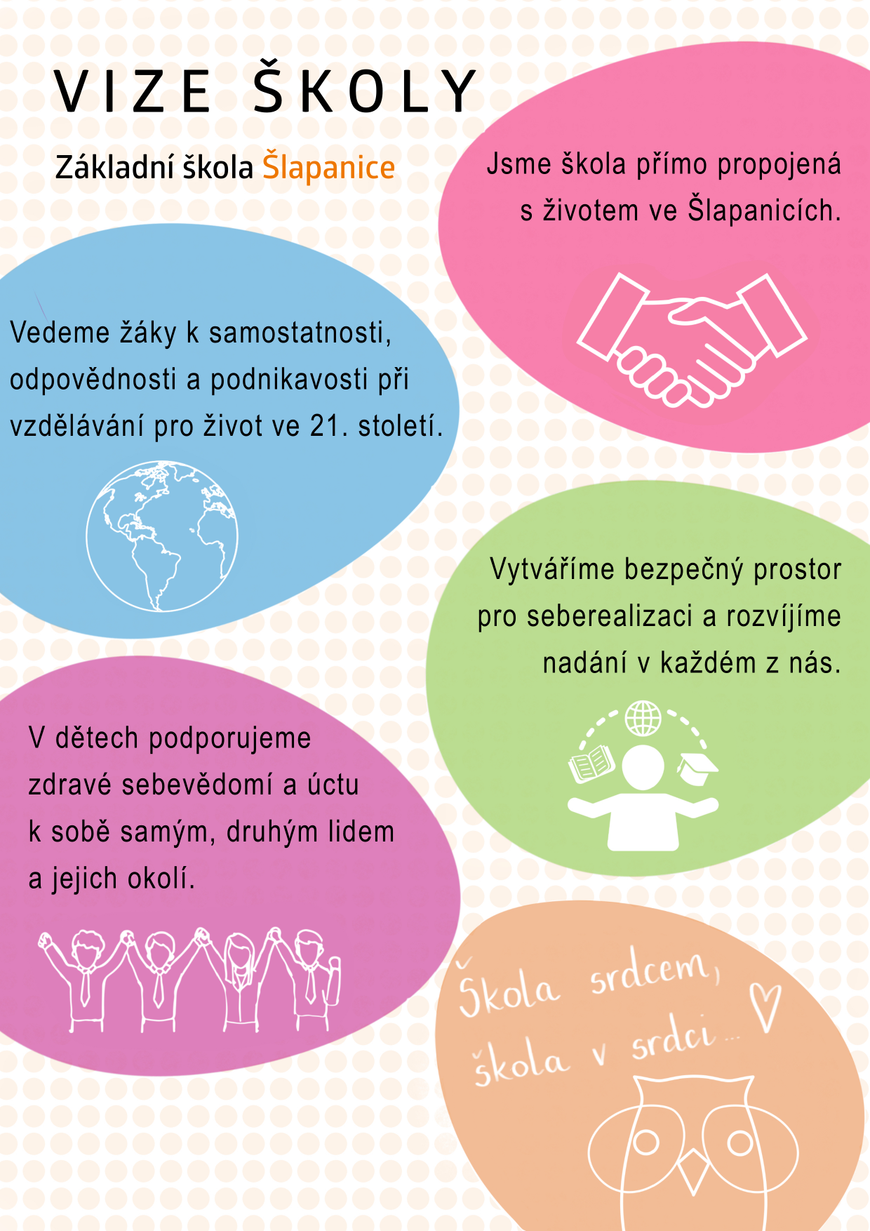 Jsme škola přímo propojená s životem ve Šlapanicích. Vedeme žáky k samostatnosti a odpovědnosti při vzdělávání pro život v 21. století. Vytváříme bezpečný prostor pro seberealizaci a rozvíjíme nadání v každém z nás. V dětech podporujeme zdravé sebevědomí a úctu k sobě samým, druhým lidem i jejich okolí.